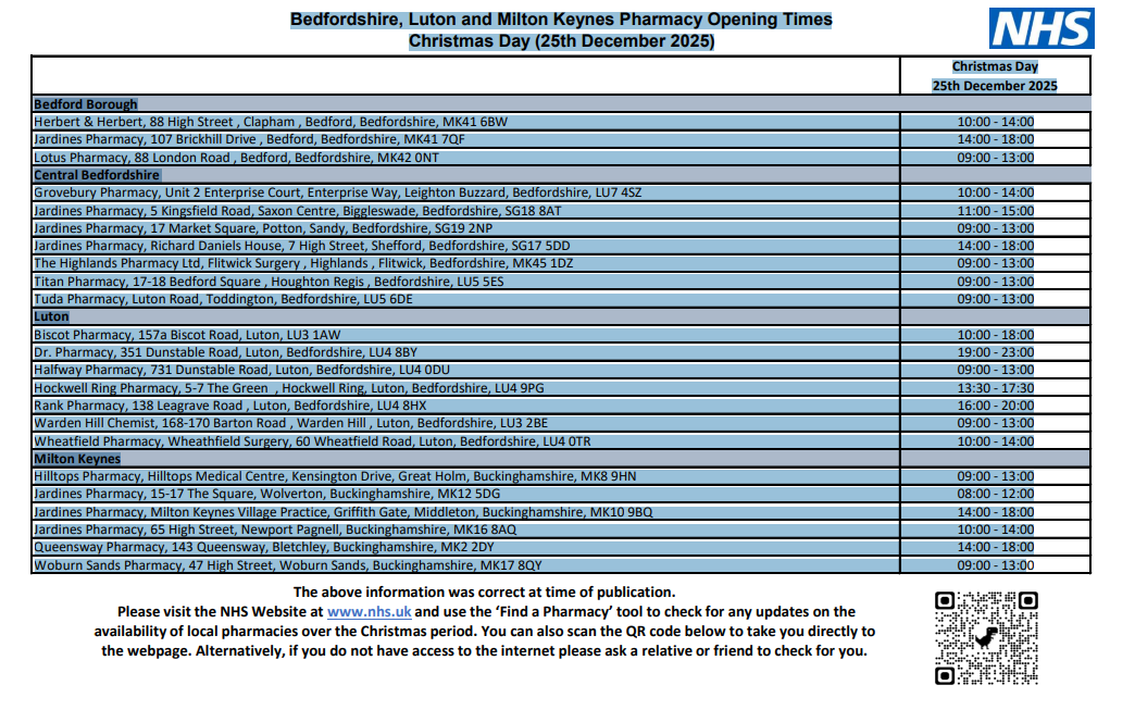 Bedfordshire, Luton and Milton Keynes Pharmacy Opening Times Christmas Day (25th December 2025) Posted on: 17th December 202517th December 2025